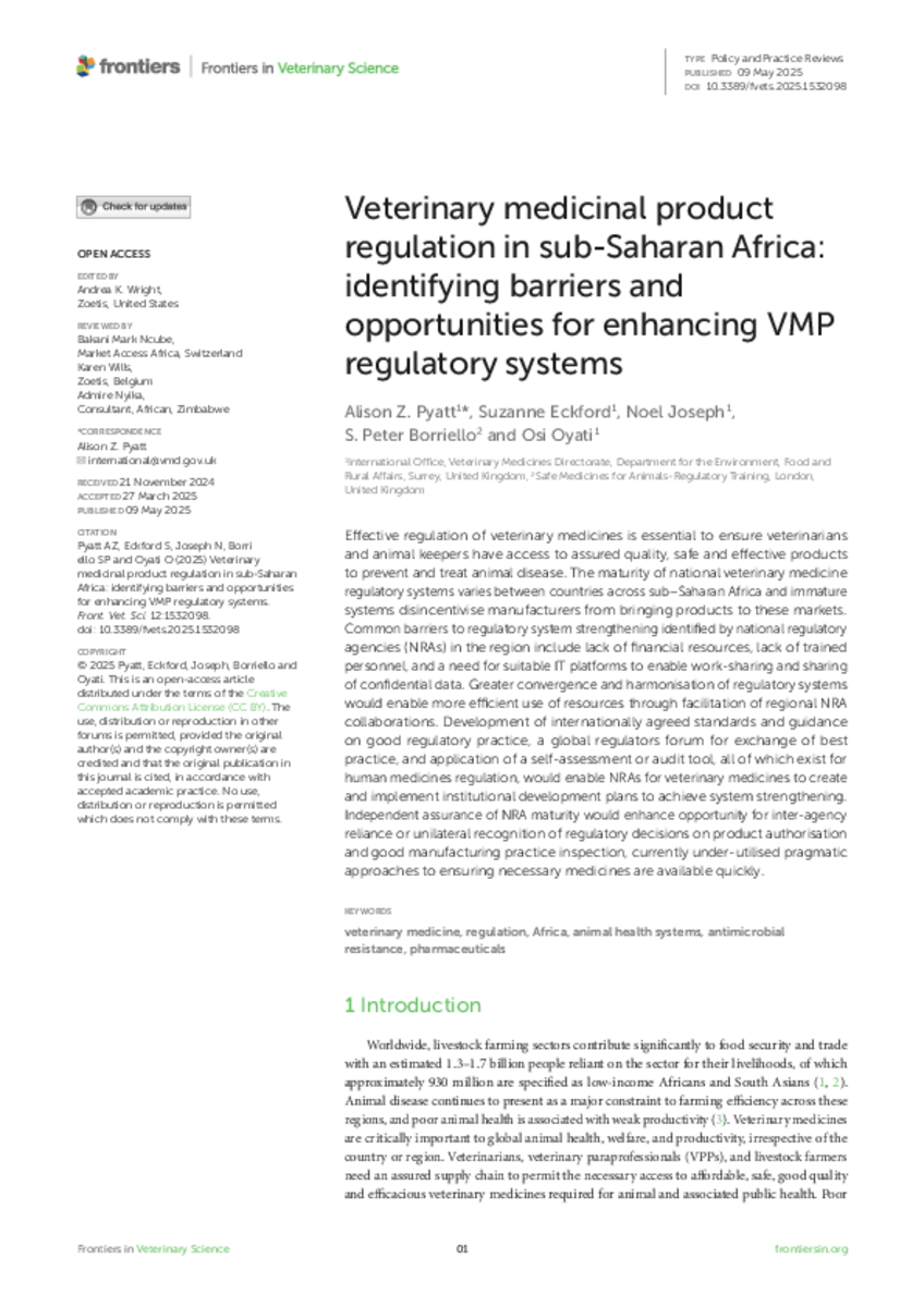 Effective regulation of veterinary medicines is essential to ensure veterinarians and animal keepers have access to assured quality, safe and effective products to prevent and treat animal disease. The maturity of national veterinary medicine regulatory systems varies between countries across sub–Saharan Africa and immature systems disincentivise manufacturers from bringing products to these markets. Common barriers to regulatory system strengthening identified by national regulatory agencies (NRAs) in the region include lack of financial resources, lack of trained personnel, and a need for suitable IT platforms to enable work-sharing and sharing of confidential data. Greater convergence and harmonisation of regulatory systems would enable more efficient use of resources through facilitation of regional NRA collaborations. Development of internationally agreed standards and guidance on good regulatory practice, a global regulators forum for exchange of best practice, and application of a self-assessment or audit tool, all of which exist for human medicines regulation, would enable NRAs for veterinary medicines to create and implement institutional development plans to achieve system strengthening. Independent assurance of NRA maturity would enhance opportunity for inter-agency reliance or unilateral recognition of regulatory decisions on product authorisation and good manufacturing practice inspection, currently under-utilised pragmatic approaches to ensuring necessary medicines are available quickly.